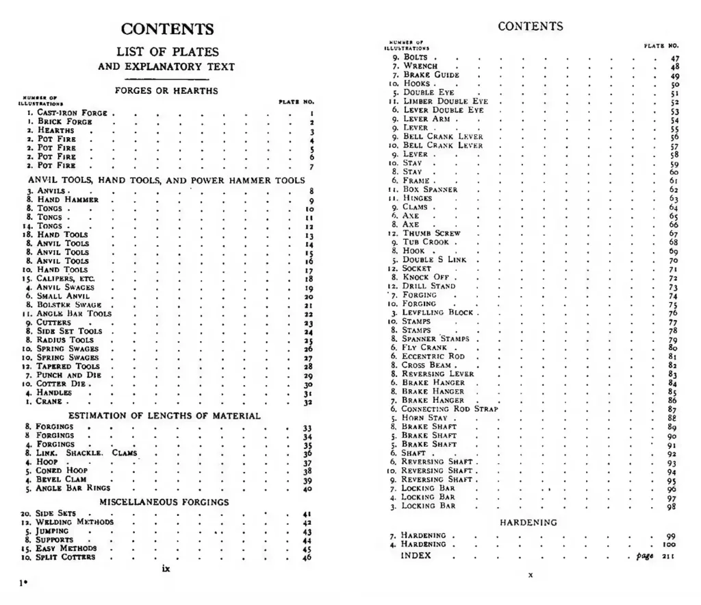 The manual covers hammers, tongs, chisels, punches, wrenches, hooks, levers, clamps, hinges, and many other tools with detailed instruction. Check the contents section above.
